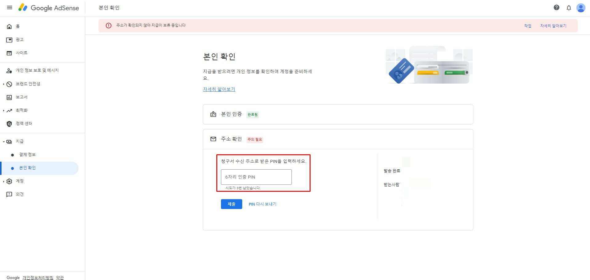 최소 구글애드센스 수입이 충족되면 우편으로 PIN 번호가 도착하죠!