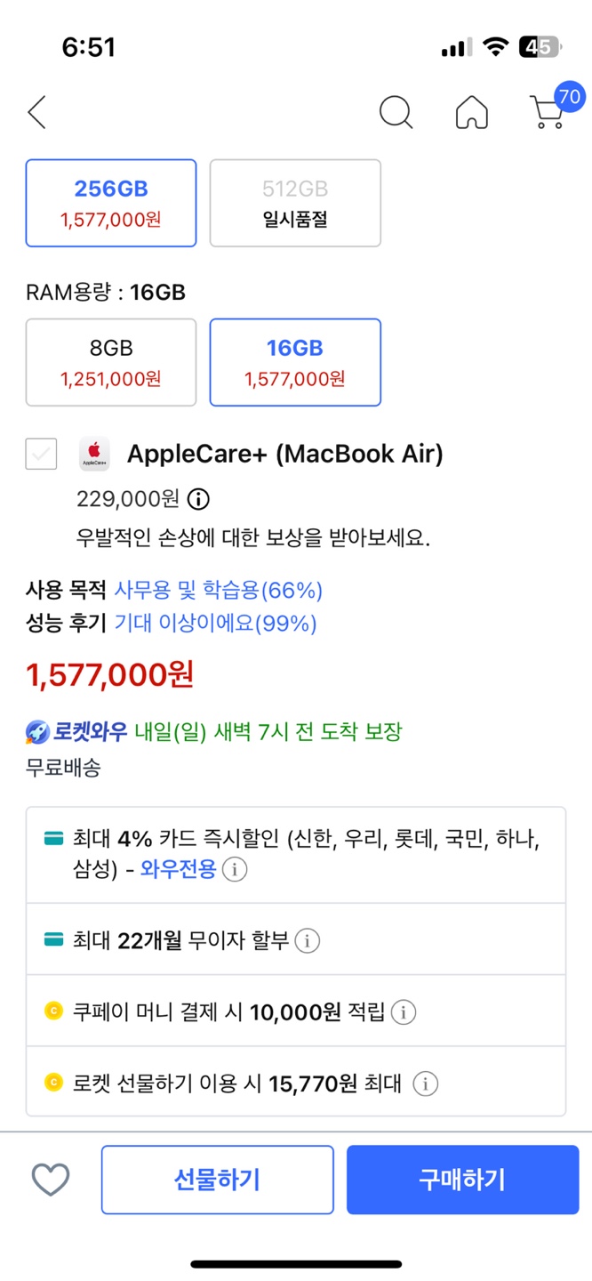 1,577,000원 - 16,000원(카드 할인) - 15,610(선물하기) = 1,545,390원
