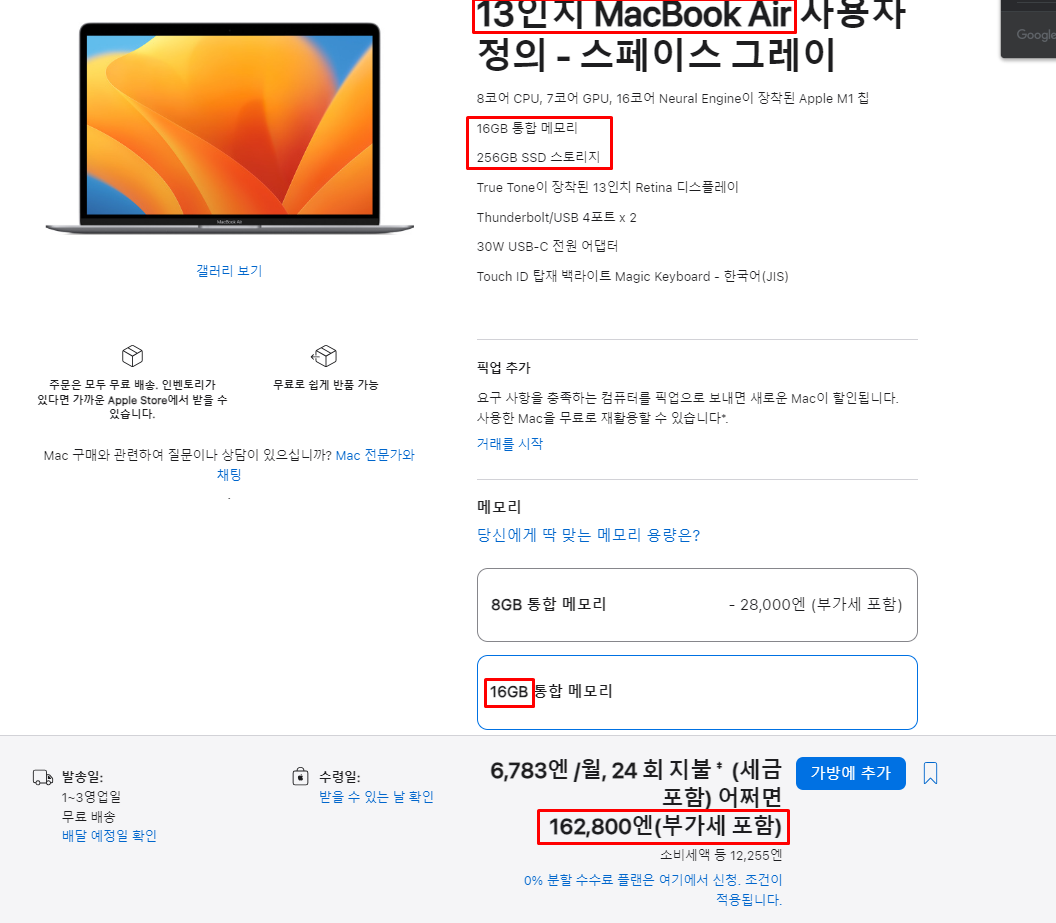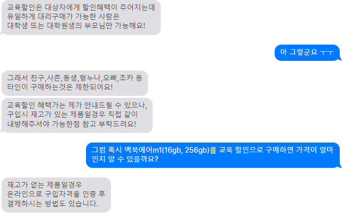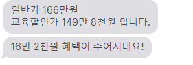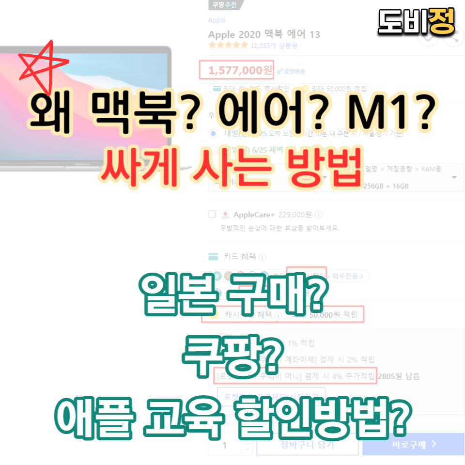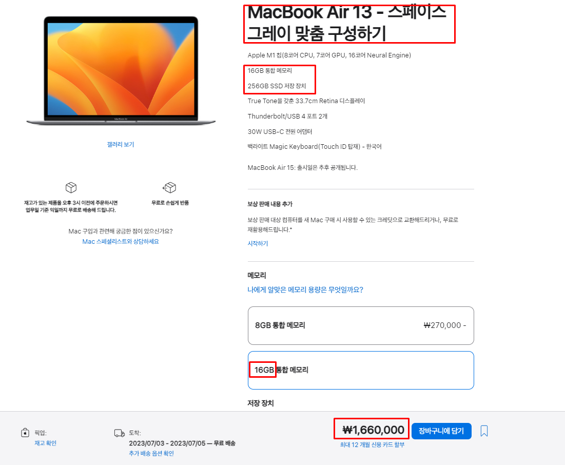 - 맥북 M1 (16GB, 254GB) 일반가: 166만 원 - 162,000원(애플 교육할인가) = 1,498,000원(최종 교육할인가)