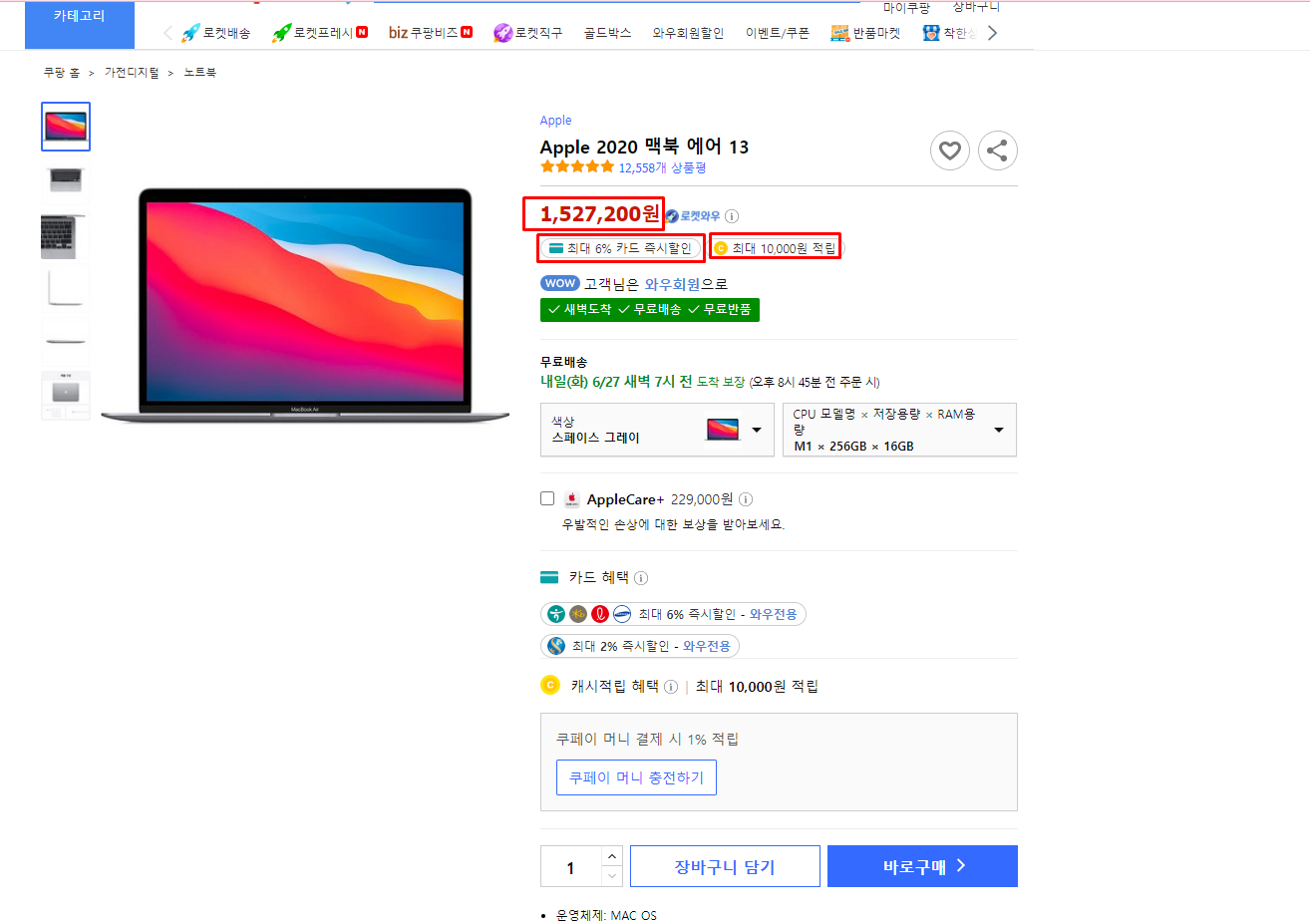 1,527,200원 - 91,640원(카드 6% 할인) - 14,356 원(선물하기/쿠팡캐시 적립예정) = 1,421,204원