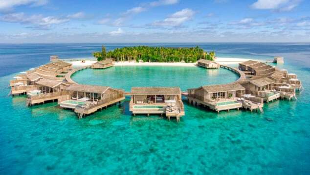 이 새로운 5성급 섬 휴양지에는 100개의 빌라 중 대부분이 물 위에 있습니다. 바다의 움직임을 반영한 각각의 디자인은 독특한 원형 디자인이며 오스트리아와 독일에서 선적된 지속 가능한 목재로 만든 독특한 수직 목재 칸막이를 갖추고 있습니다. 대부분의 리조트 빌라에는 태양광 패널 지붕이 있으며 관리 목표는 2023년까지 100채 모두에 이 기술을 갖추는 것입니다.