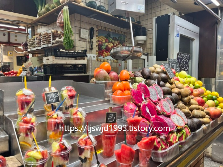 보케리아 시장에 관광객들이 과일컵도 많이 들고 있지만 스타벅스 음료잔도 많이 들고 있습니다:)