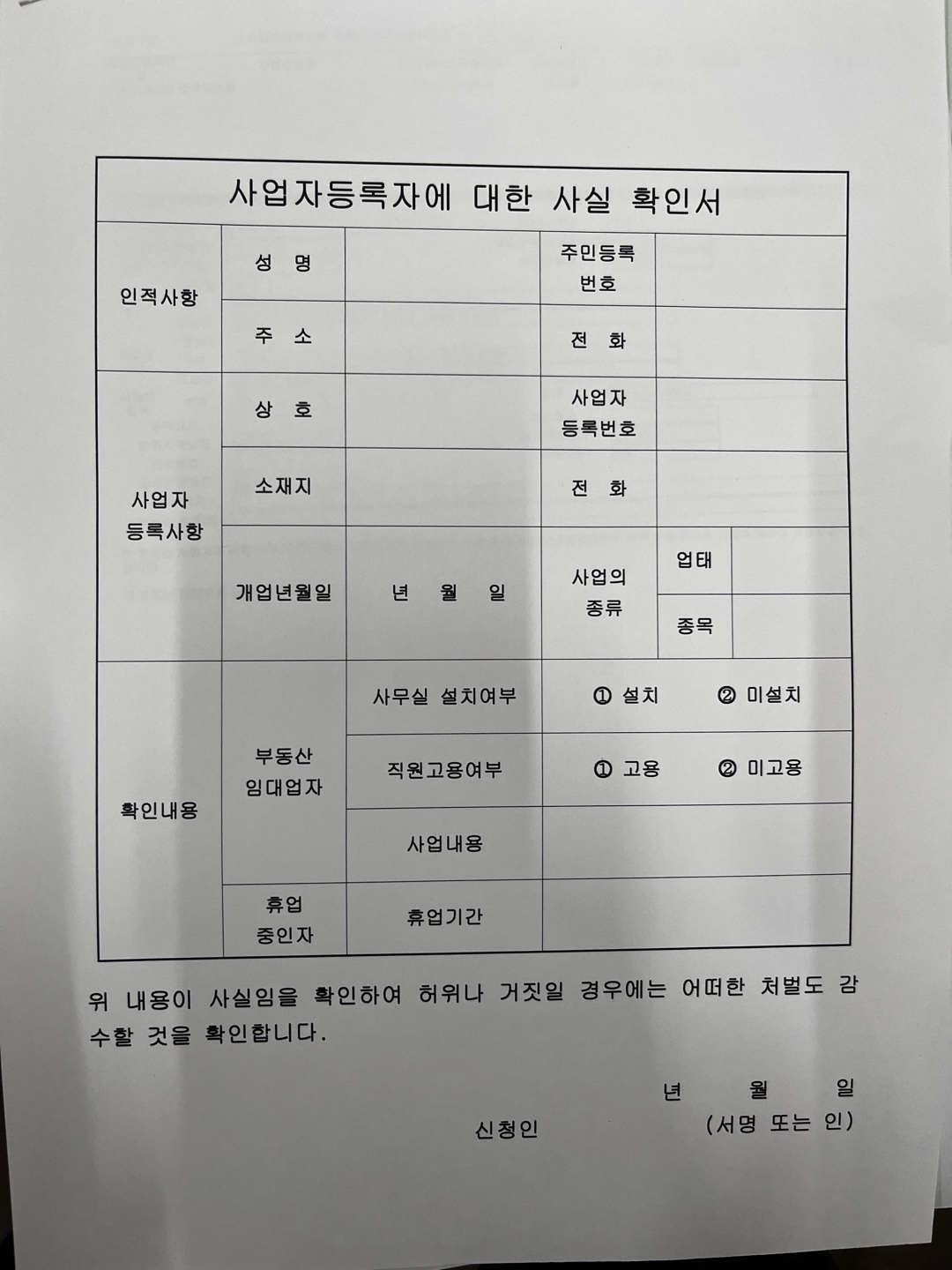 - 사업자등록자에 대한 사실 확인서(신청자가 사업자인 경우 / ex. 네이버 쇼핑몰 사업자 등록한 신청자)