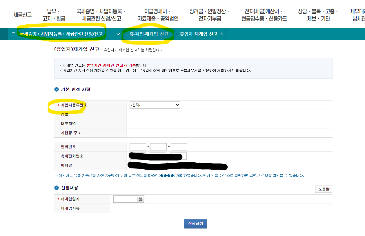 처음 사업자등록할 때에도 홈텍스에서 했는데, 휴업과 폐업 신청도 홈텍스더라고요:)