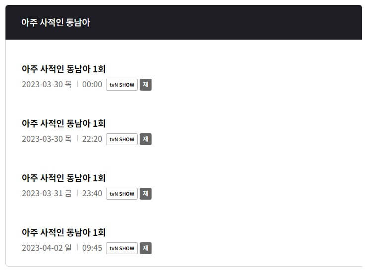 아주 사적인 동남아 재방송 시간은 3월 30일(목) 00시, 13시, 22시 20분/ 3월 31일(금) 23시 40분/ 4월 2일 9시 45분이다.