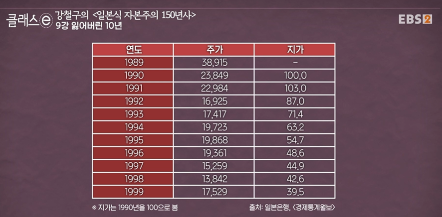 - 주식 버블 붕괴(주식): 1989년 12월에 최대치 니케이 지수 찍음. 이후 4분의 1가격으로 떨어짐.