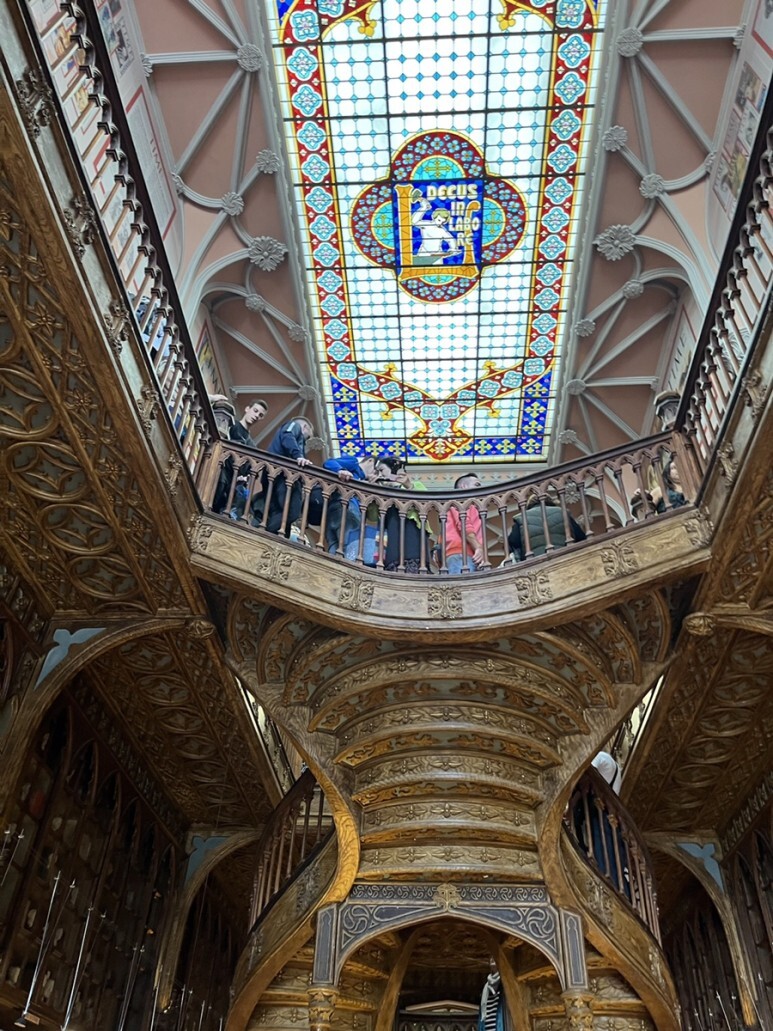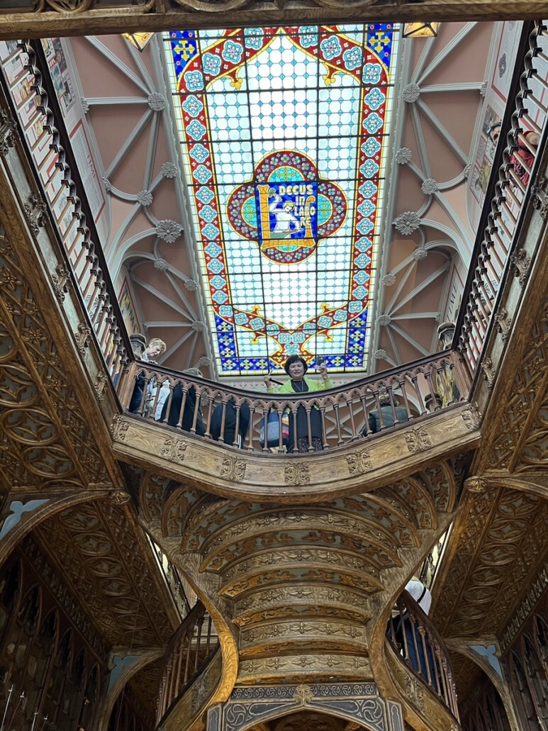 렐루서점 내에 붉은 계단, 천장의 스테인드글라스가 상징입니다:)
