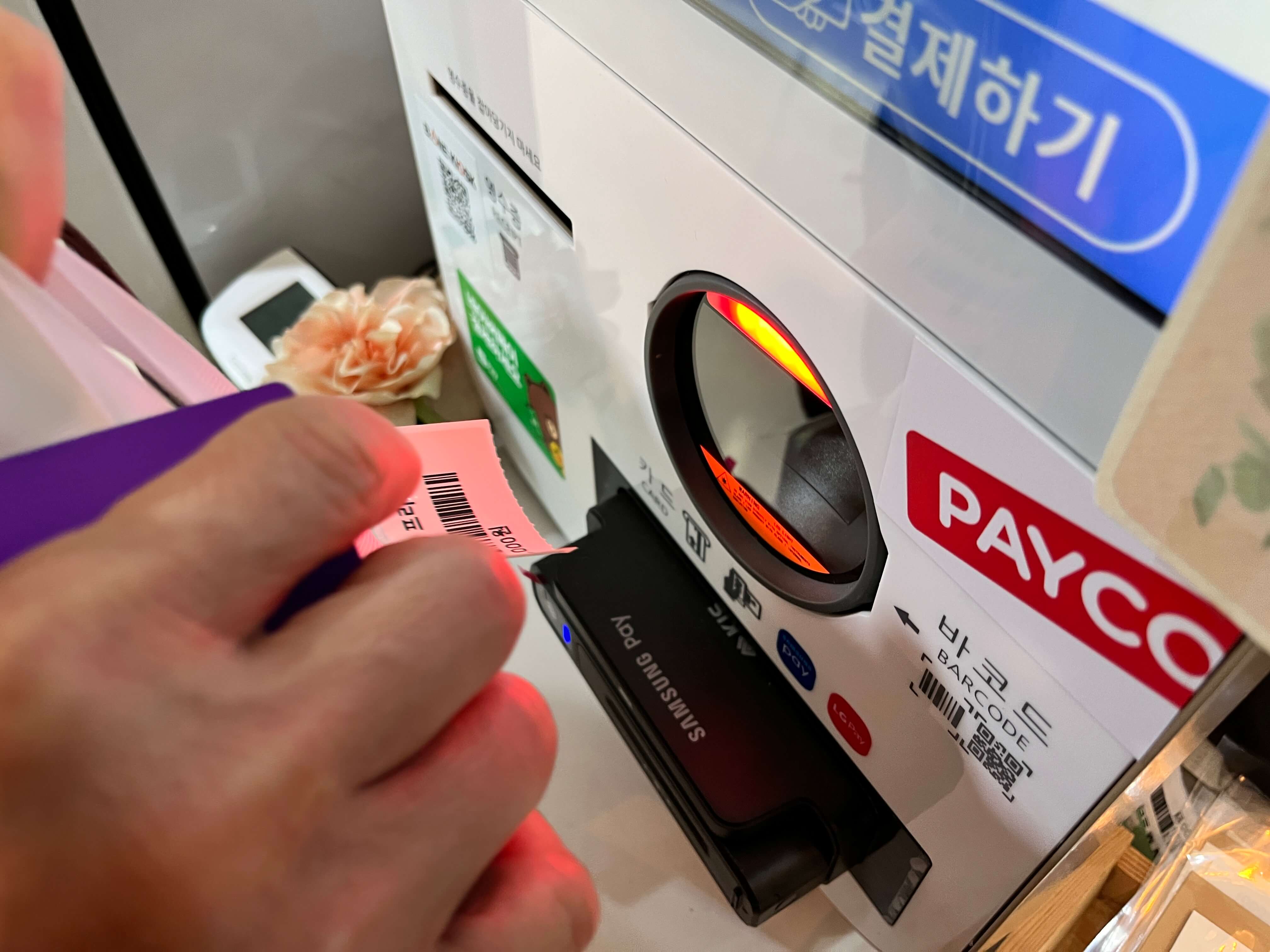 바코드를 무인계산기에 찍으면 됩니다(일반 마트에서 셀프 계산하는 방식과 동일)