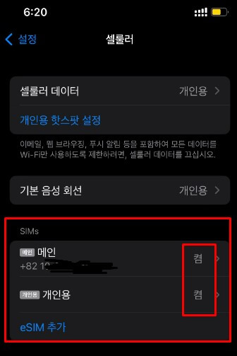 2. 셀룰러 SIMs에 왜 2개가 뜨는지( 메인, 개인용)
